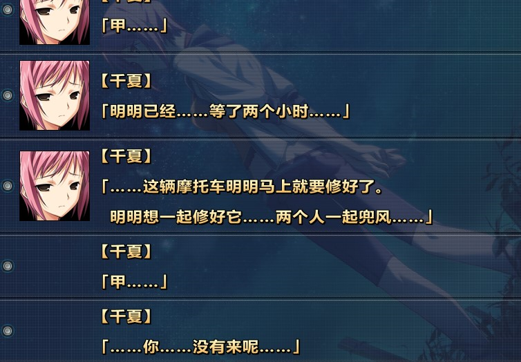 DIVE1中蕾和千夏感情线相当可圈可点,但到了DIVE2中的角色就实属尴尬了。真的感情线让我感觉几乎是换了个人写,空则是一望到头——永恒的守望、无数平行世界、可能性的结局、轮流便当吐便当,这一切放在今天来看,并不能说不好,但确实眼熟,更要考验作者笔力。进了空线之后,前面可以算得上优点的ACT系统也让我和门仓甲一起破口大骂,“到底有完没完”,一波又一波的无人机让我搓了整整十三个小时的连招。当我以为他堆这么多怪终于找不出来游戏性、准备给最终BOSS几套加特林五连鞭结束这一切的时候,广阔无垠、雄壮激昂、悠扬婉转的音乐与那个毫不逊色的敌人一齐登场,我如饥似渴顶着腱鞘炎的风险与他激战数番。最后,面对这个寻常却难得、平凡但奇迹的完美既定结局,我也不由自主地祝愿他们在这里能够继续绽放笑颜,幻想着如月寮下一个日常欢乐的幸福故事。