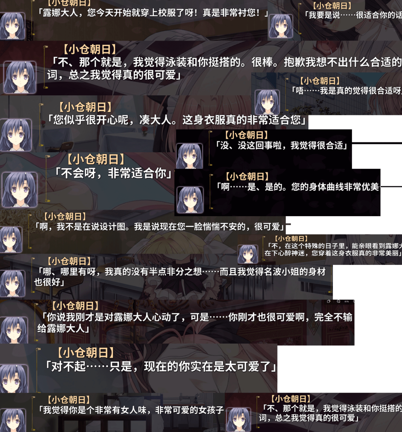 但我真的看不下去夸夸了。不算确定关系之后的狂夸,我愣是截出来快二十个小仓朝日说“你真的很可爱”,“真的很合适你”,“身材真的很好”。就连有夺妻之仇的名波七爱被朝日夸上两遍都要开始脸红颤抖走马灯回忆往昔,就连教科书傲娇的尤希尔被朝日夸上两句都要扭过头去脸红沉默不语,到了柳之濑凑更是夸夸重灾区,每次被夸上一句就仿佛突发心肌梗塞一样开始抽搐脸红。此等夸夸事迹在《常轨脱离Creative》中亦有多次记载,但我这辈子都不想再打开去搜集一下夸夸了。