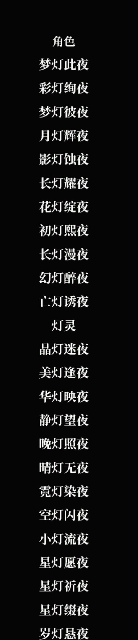 设定里角色姓的第二个字都是灯,角色名的第二个字都是夜。其实一开始遇到几个角色这个格式我觉得这个格式挺帅的,而且喻人于字,非常好。但这样的人名登场三十个的时候我终于分不清谁是谁了。
