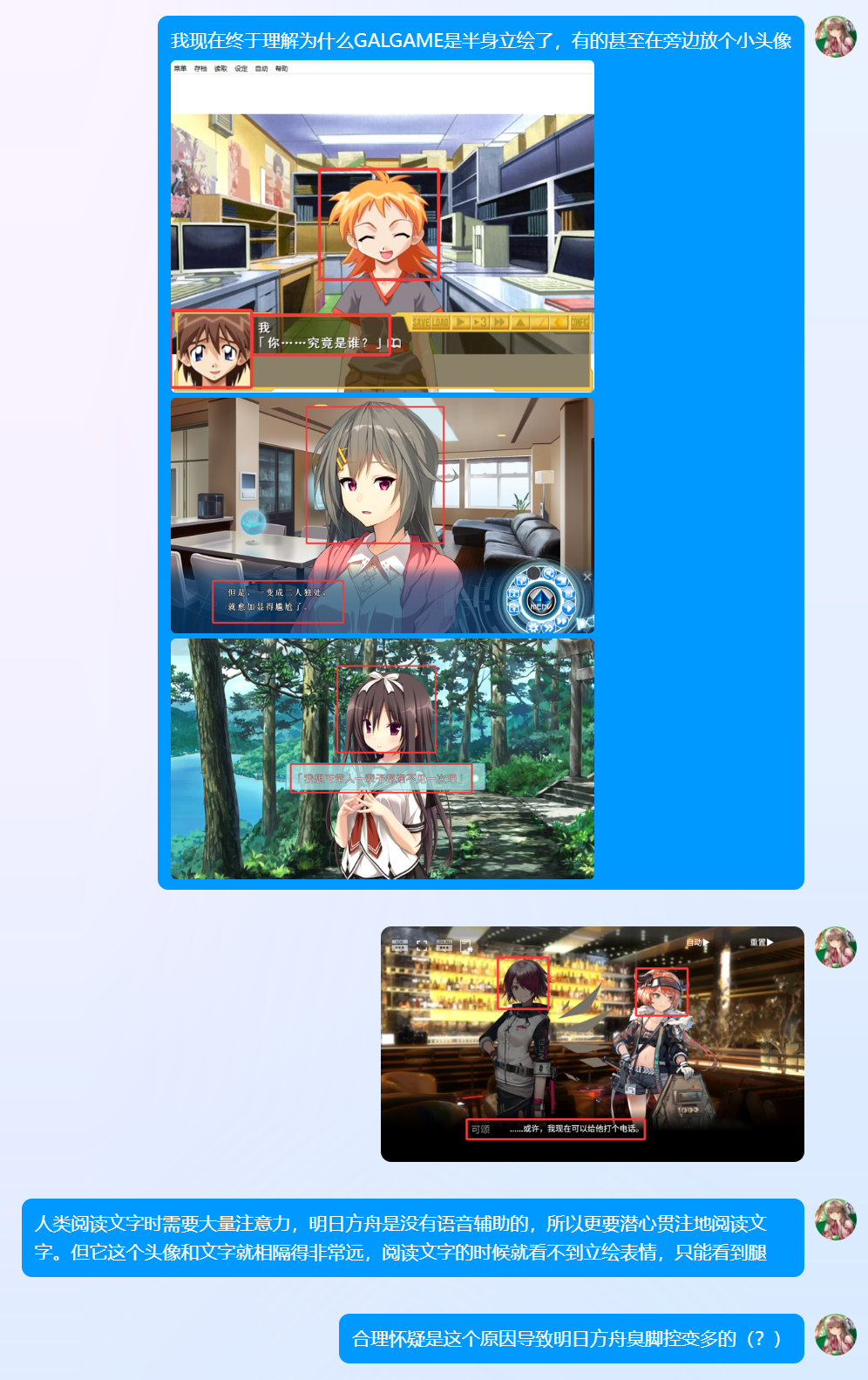 GALGAME就是这种设计,部分游戏会把小头像直接放在文字旁边,甚至有的游戏会把文本搬到角色脸上。就算没有小头像,也会尽可能让角色表情不会离文本太远——GAL大都是半身绘。