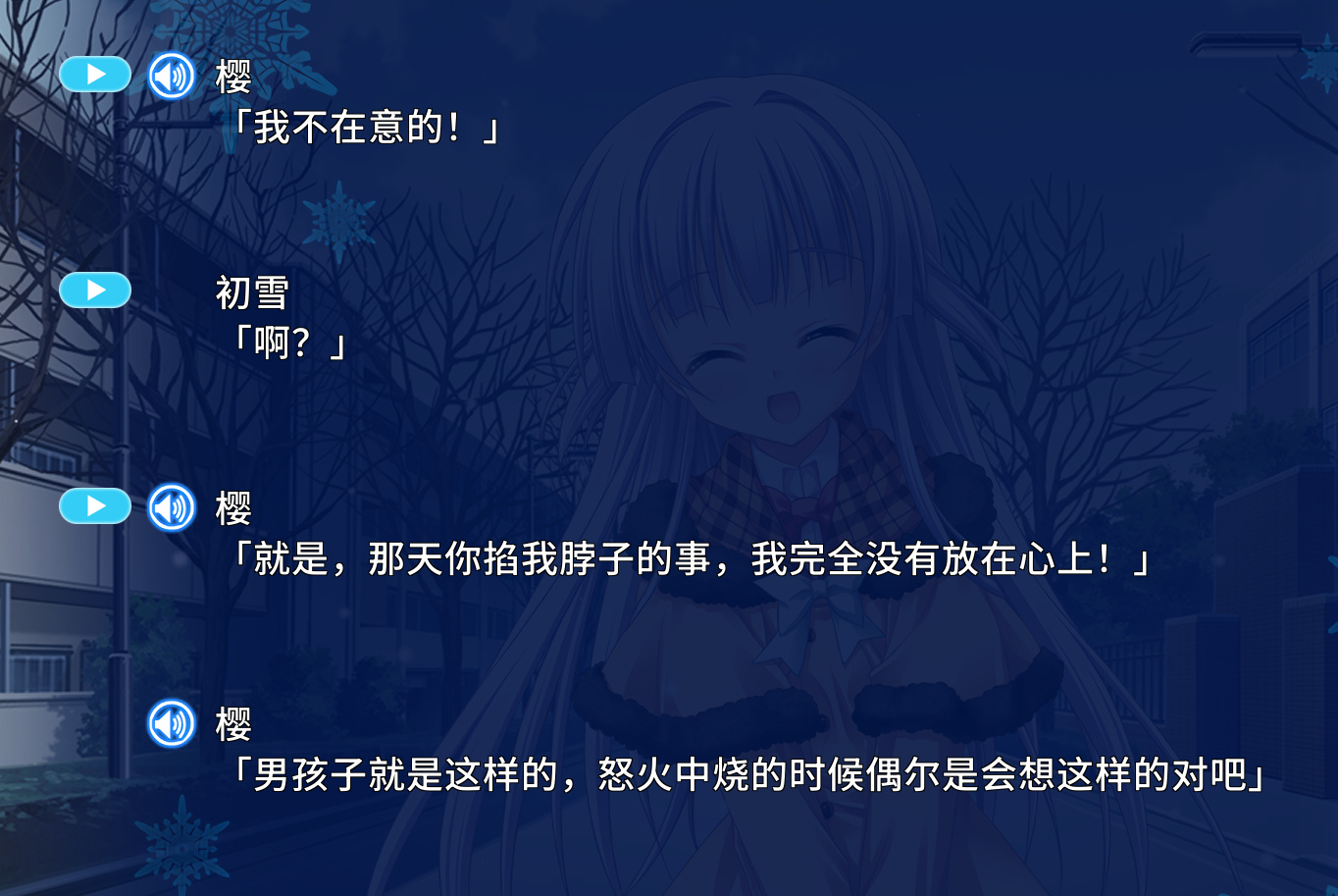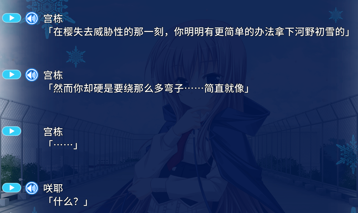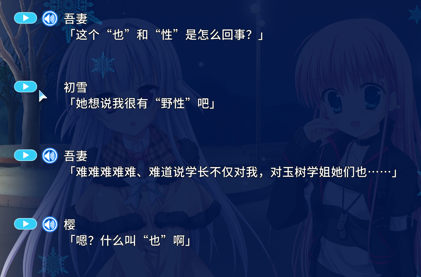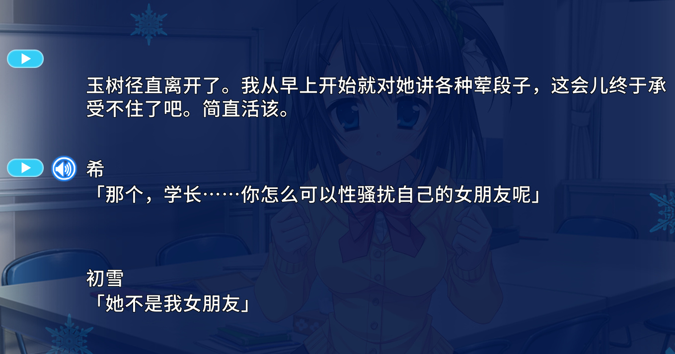 虽然前女友这种设定在GAL里是很新奇的,但我当时玩完是没有什么感受的。第一是我确实不喜欢这种百依百顺的女友、木讷懵懂的男主,第二我觉得应该是我没有沉下心来玩,第三是作者这个笔力确实是普普通通。于是我觉得是我自己的问题,我继续憧憬着新岛夕的另一部作品——《初雪樱》。