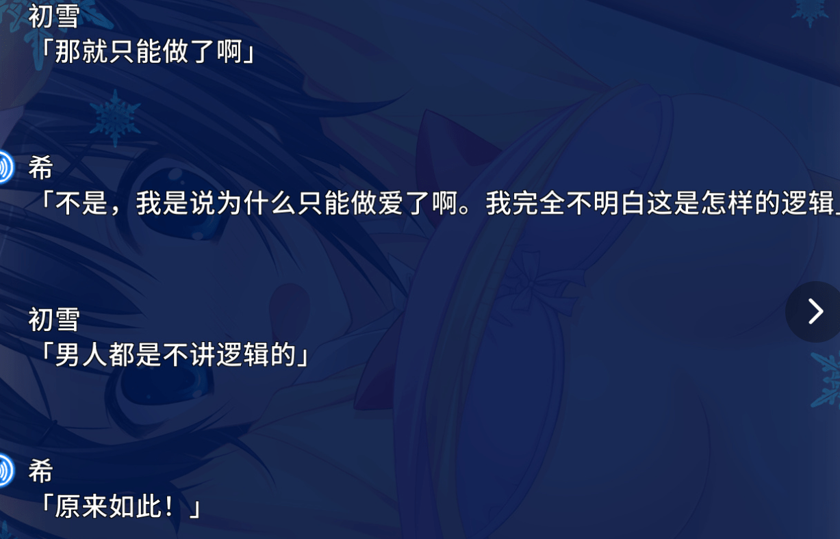 但到了后期之后我就彻底放弃思考了,你说什么那就是什么吧,我看出来了,个人线的一堆剧情就是为了把逼草了。其他剧本家还会整一个很长的剧情掩饰一下,你就直接把两个人拢在一起,两个人走出去没几步,个人线女主就仿佛发现了世界天地的秘密一样参悟出一个道理:“我好像喜欢他”,就这样告白然后开始做爱了。