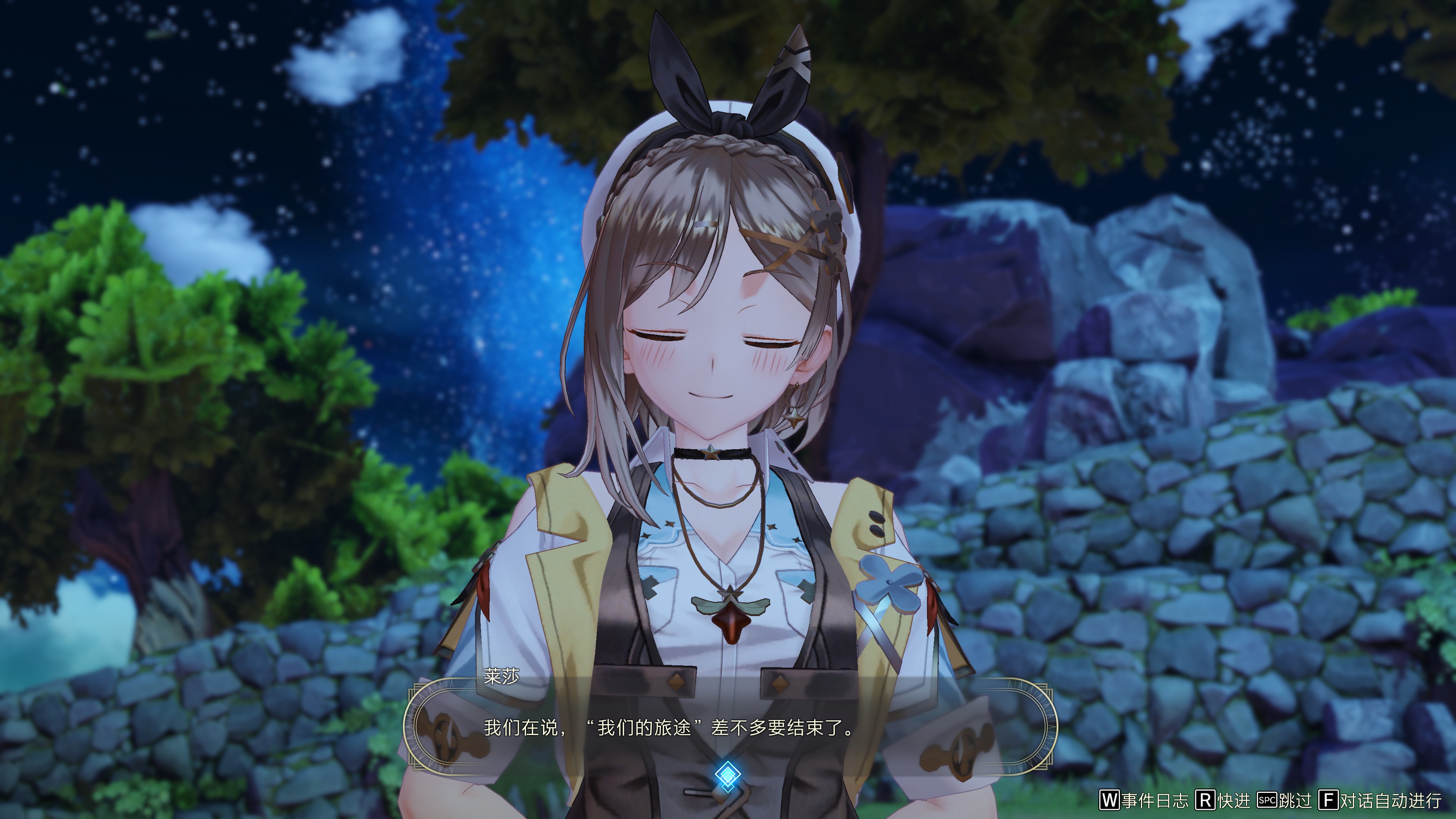 剧情太白开水了,演出节奏太慢了。我恨不得直接跳过剧情,于是我打开了二倍速播放剧情,自己跑到大锅前,算计着装备上的每一个特性;我在空旷的地图上跑图躲怪,一边骂着这地图怎么这么大又没东西、一边奔向下一个传送点;我一点点攀着科技树,尽管触摸不到那颗红彤彤的贤者之石,但我仍然百看不厌、爱不释手,一遍又一遍地欣赏着它的数值;我看着角色在屏幕上帅气地飞舞,并且打出成吨的伤害,我很开心;我摆弄着自己的刚到手的新玩具们,当投下素材的时候,整个屏幕闪闪发光,一直以来困扰自己的难题瞬间灰飞烟灭,我高兴极了;我把男角色都踢到冷板凳,我拿着999品质的道具和武器兴高采烈地出门左拐打桩,我用纸笔潜心研究着怎样才能把想要的特性打上去。正当我沉浸其中之时,突然,兰托望着远方,对莱莎说,“我们的旅途差不多要结束了”。我愣住了,关掉了二倍速。不知为何,一股悲伤油然而生、直上心头。