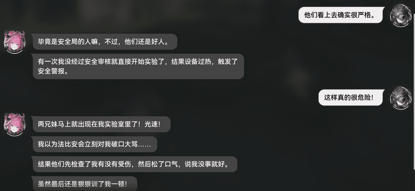 这简直就是把“关心伊冯”、“注重安全”、“严厉”这几个词抛在屏幕上了,生怕玩家理解不了。但伊冯是个小淘气的性格,你家小淘气会直言不讳地说:“他们好关心我啊”这种句子吗?或者说你觉得她弱智到“能说出这种台词,但不知道他们在关心我”?