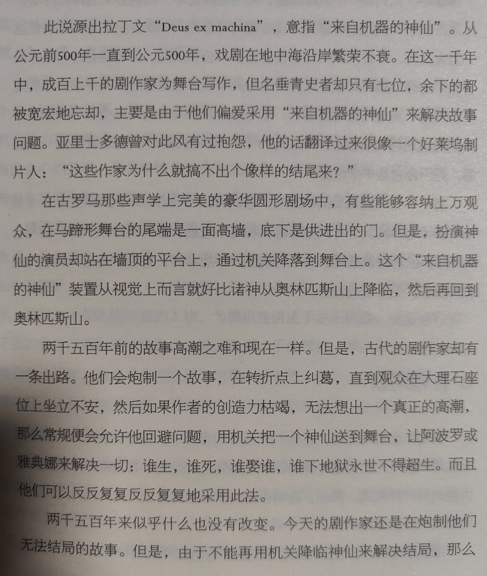 两千五百年前的故事高潮之难和现在一样。但是,古代的剧作家却有一条出路。他们会炮制一个故事,在转折点上纠葛,直到观众在大理石座位上坐立不安,然后如果作者的创作力枯竭,无法想出一个真正的高潮,那么常规便会允许他回避问题,用一个机关把一个神仙送到舞台,让阿波罗或雅典娜来解决一切:谁生,谁死,谁娶谁,谁下地狱永世不得超生。而且他们可以反反复复反反复复地采用此法。——《故事》